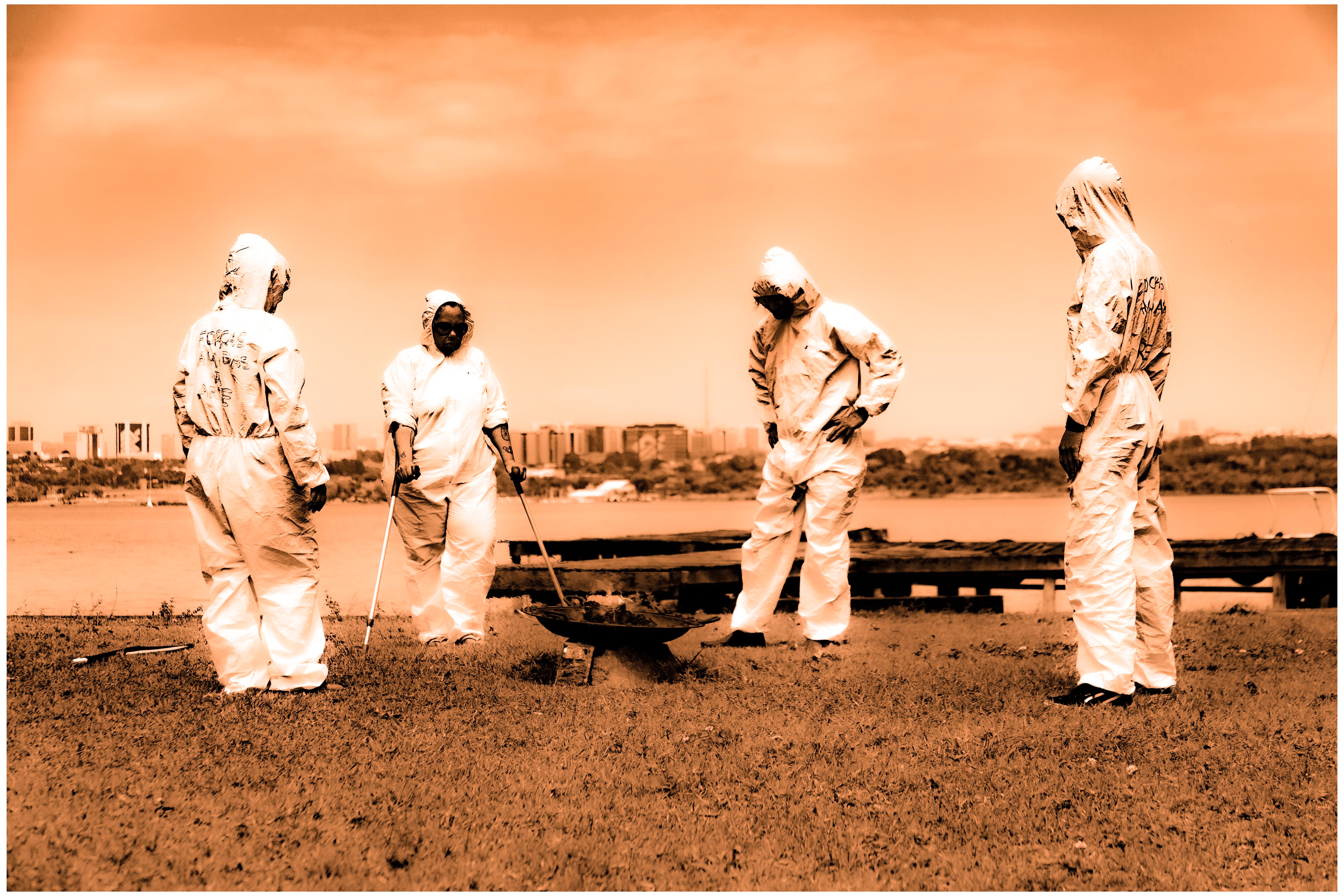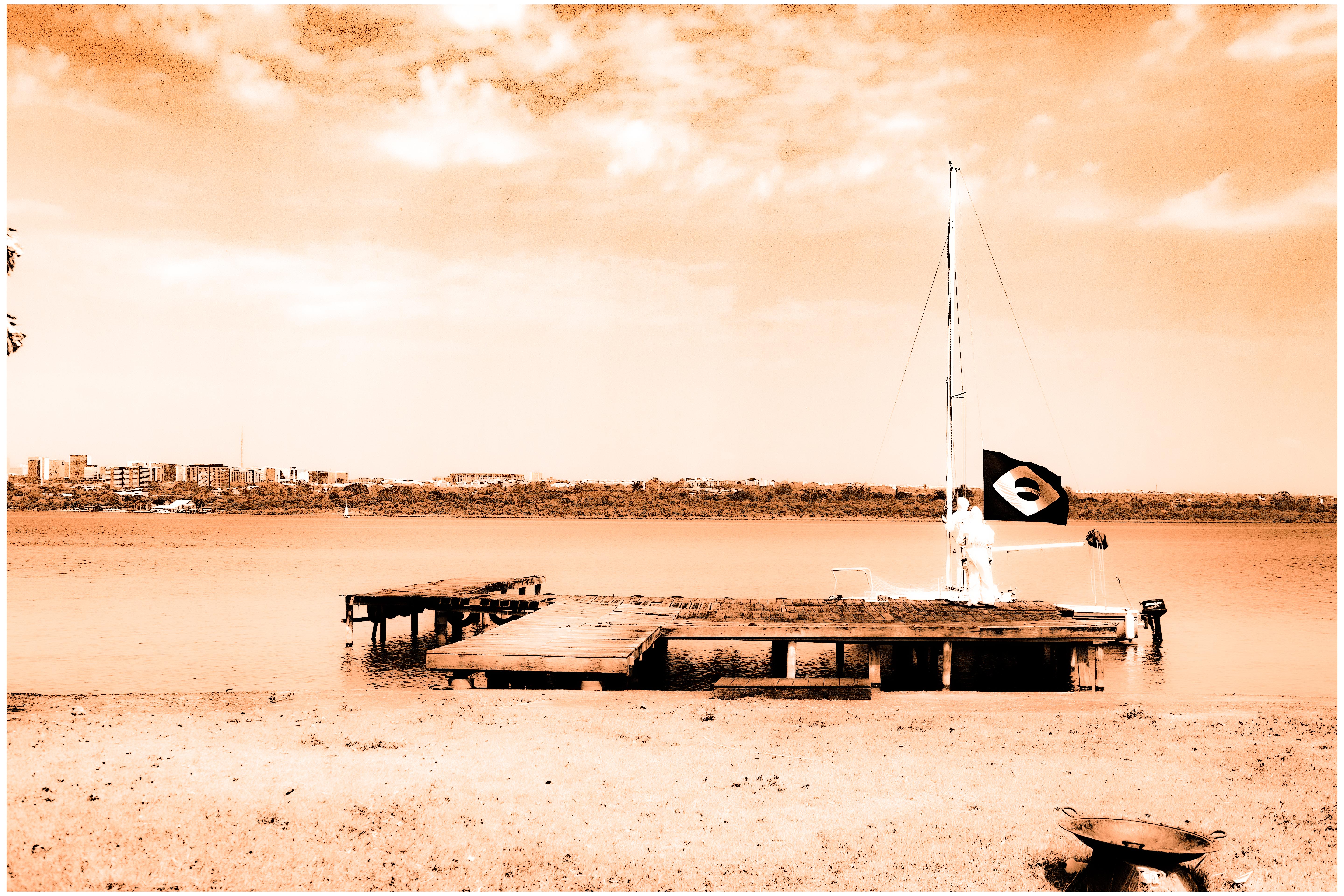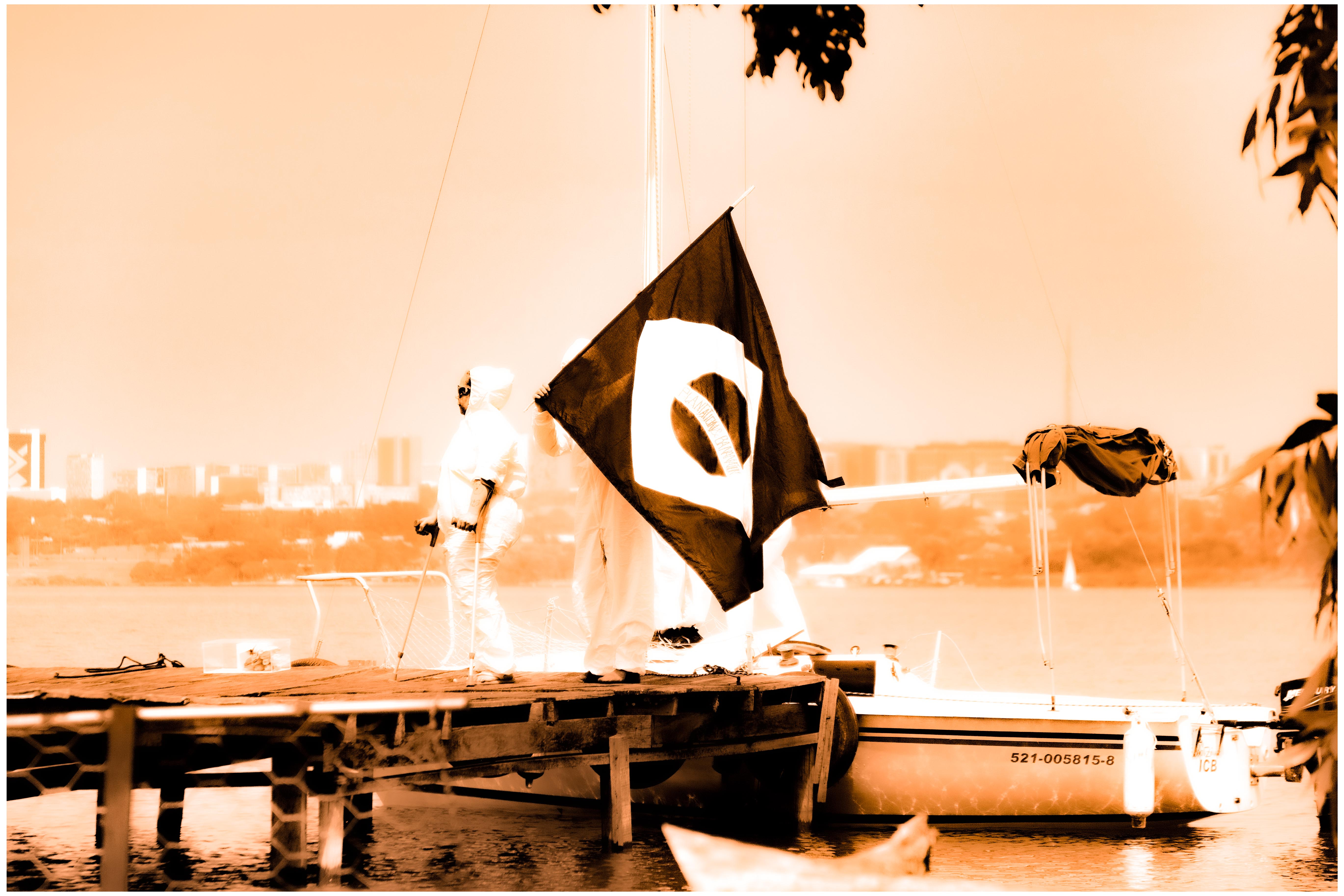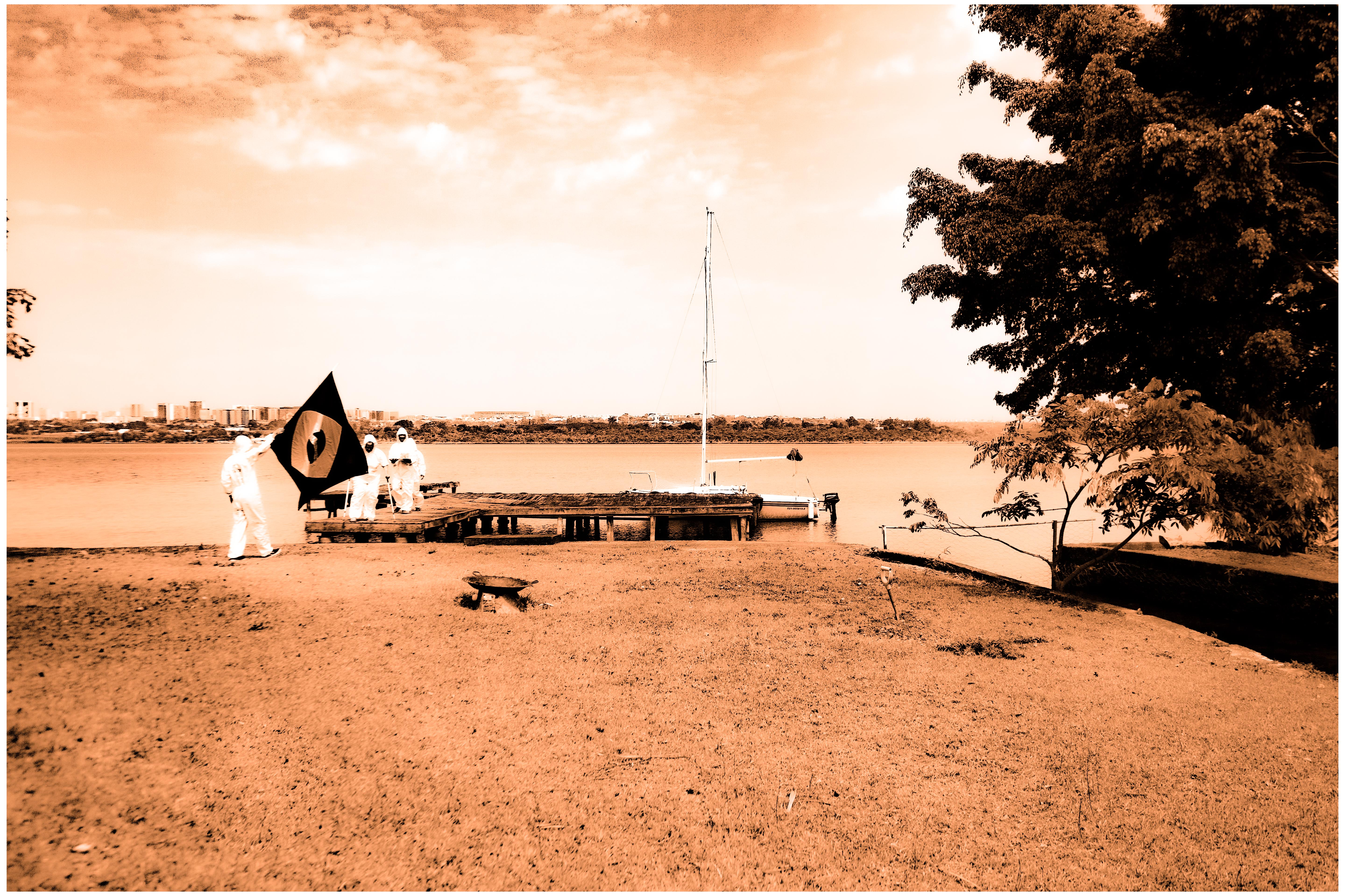 Queima e enterro da bandeira brasileira às margens do Lago Paranoá, na mesma localização onde, em 1969, Cildo Meirelles realizou a ação Arte Física – Caixas de Brasília/Clareira. Aportamos em um antigo pier do Paranoá carregando uma bandeira brasileira preta-e-branca onde se lê “Plantation & Bananation”. Queimamos essa bandeira e enterramos suas cinzas numa caixa de acrílico junto a um cacho de bananas e uma fotografia da bandeira hasteada.